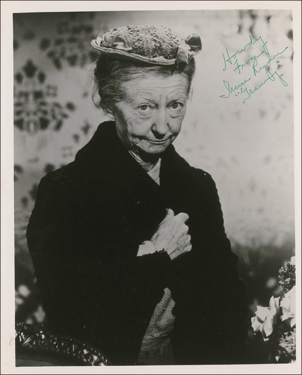 Actress (1902–1973) who found success in vaudeville, radio, film, television, and Broadway but is best remembered for her role in The Beverly Hillbillies. Glossy 8.25 x 10 photo in character drawing her shawl around her shoulders and looking disapprovingly at the camera, signed in green ballpoint, “Howdy From Irene Ryan, ‘Granny.’” In fine condition, with scattered creasing and few surface scuffs. Pre-certified PSA/DNA and RRAuction COA.