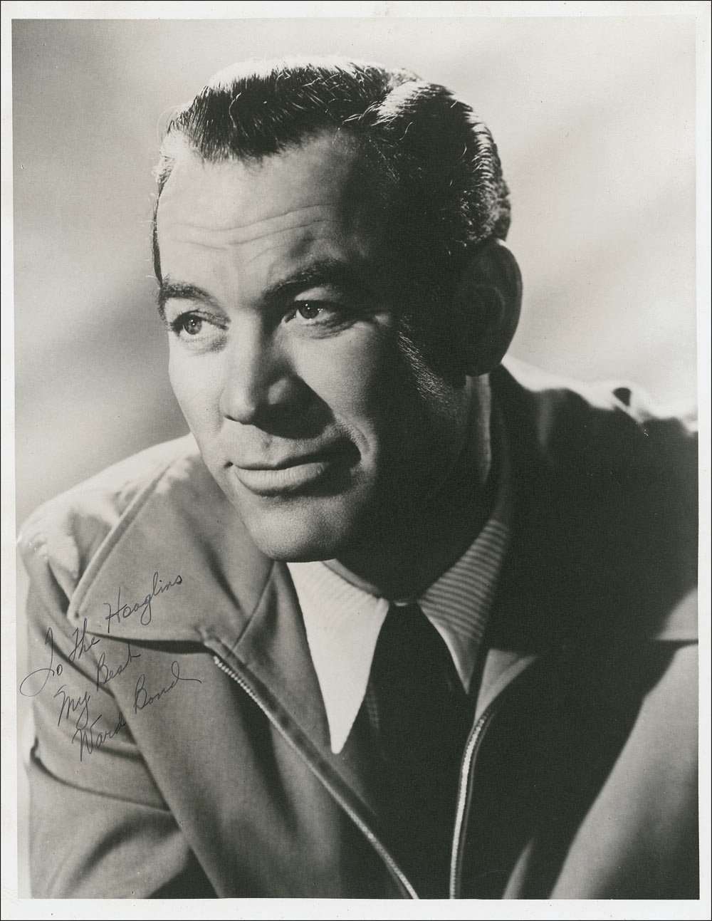 American actor (1903–1960) who appeared in seven of the AFI’s list of the 100 Greatest American Movies: It Happened One Night, Bringing Up Baby, Gone With the Wind, The Grapes of Wrath, The Maltese Falcon, It’s a Wonderful Life, and The Searchers. In the mid-1950s he attained his greatest fame as star of TV’s Wagon Train. Vintage matte-finish 11 x 14 photo, signed and inscribed in fountain pen “For the Hoaglins, My best, Ward Bond.” In fine condition, with a couple of light background creases, as well as a few mild ripples, not affecting overall appearance. Pre-certified PSA/DNA and RRAuction COA.