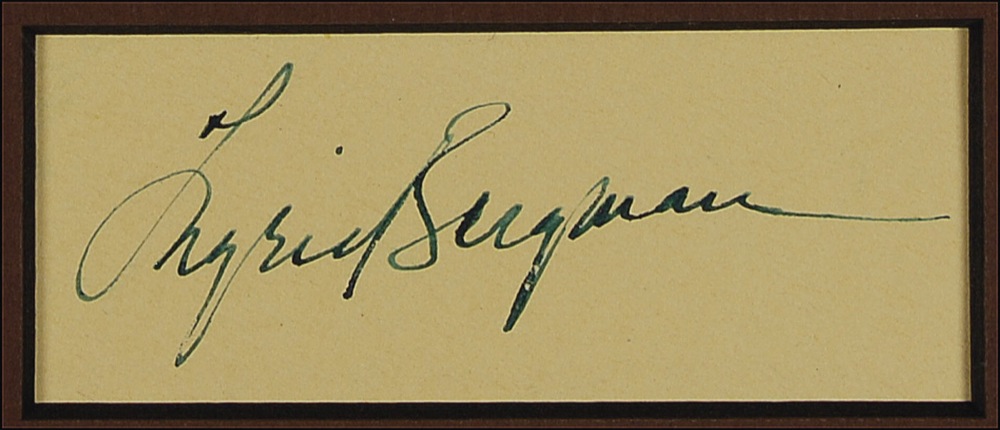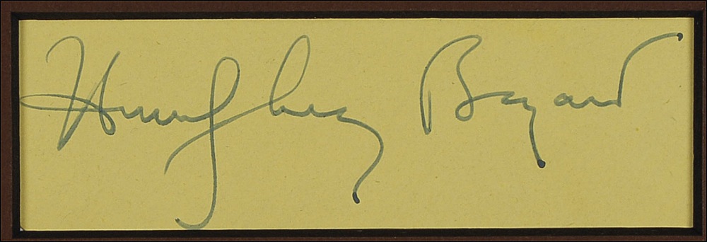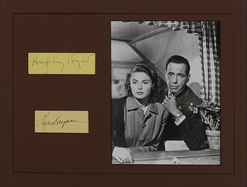 Vintage fountain pen signatures of Humphrey Bogart and Ingrid Bergman on individual yellow album pages, matted with a photo of the iconic couple in a scene from Casablanca to an overall size of 16 x 12. In fine condition. Pre-certified PSA/DNA and RRAuction COA.
