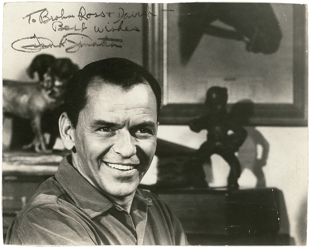 Glossy 9.5 x 7.5 photo, signed and inscribed in black pencil “To Braham Ross & David—Best wishes, Frank Sinatra.” Trimmed edges, scattered creases and surface marks, and a repaired tear to top edge, otherwise very good condition. Pre-certified PSA/DNA and RRAuction COA.