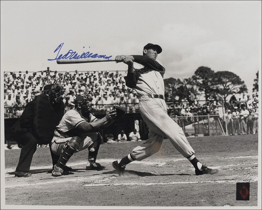 Spectacular satin-finish 20 x 16 photo of Williams swinging away, signed in blue felt tip. In fine condition, with slight rippling of the image and a Green Diamond authentication label affixed to the photo; accompanied by a certificate of authenticity from Green Diamond. Pre-certified Steve Grad/PSA/DNA and RRAuction COA.