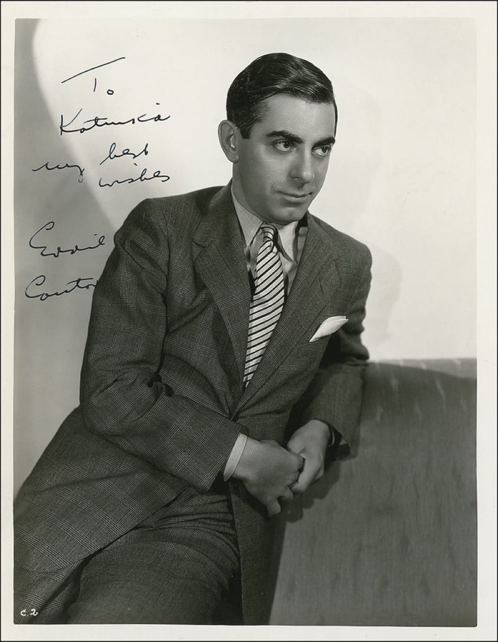 Vintage glossy 8 x 10 photo of Cantor leaning on a chair, signed and inscribed in fountain pen “To Katrinka, my best wishes, Eddie Cantor.” In fine condition, with some scattered light creases and surface marks, and a trivial chip to bottom edge. Pre-certified PSA/DNA and RRAuction COA.