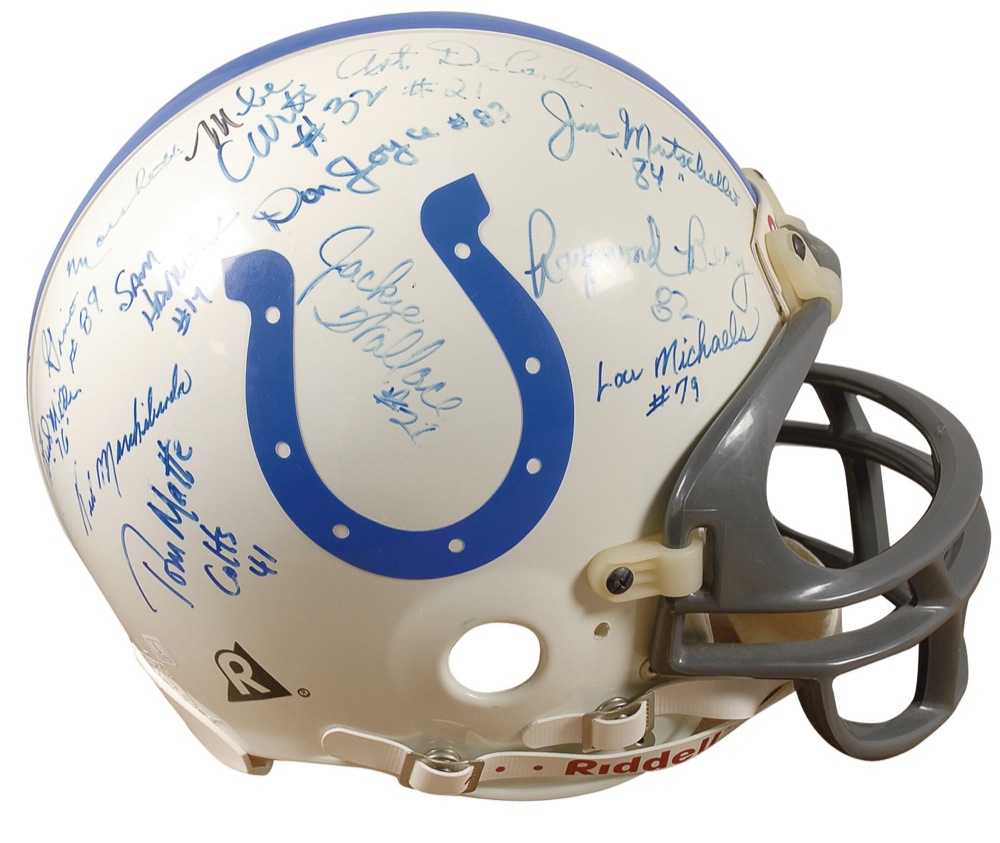 Official Riddell replica Baltimore Colts football helmet signed in blue felt tip by 22 football greats. Signers include: Johnny Unitas, Raymond Berry, Lenny Moore, Jim Parker, John Mackey, Gino Marchetti, Lou Michaels, Jackie Wallace, Don Joyce, Art DeCarlo, Tom Matte, Sisto Averno, and Jim Mutscheller. Many of the signers have added a Hall of Fame induction year or jersey number. In fine condition, with slightly irregular ink flow and adhesion to a few names. Pre-certified Steve Grad/PSA/DNA and RRAuction COA.