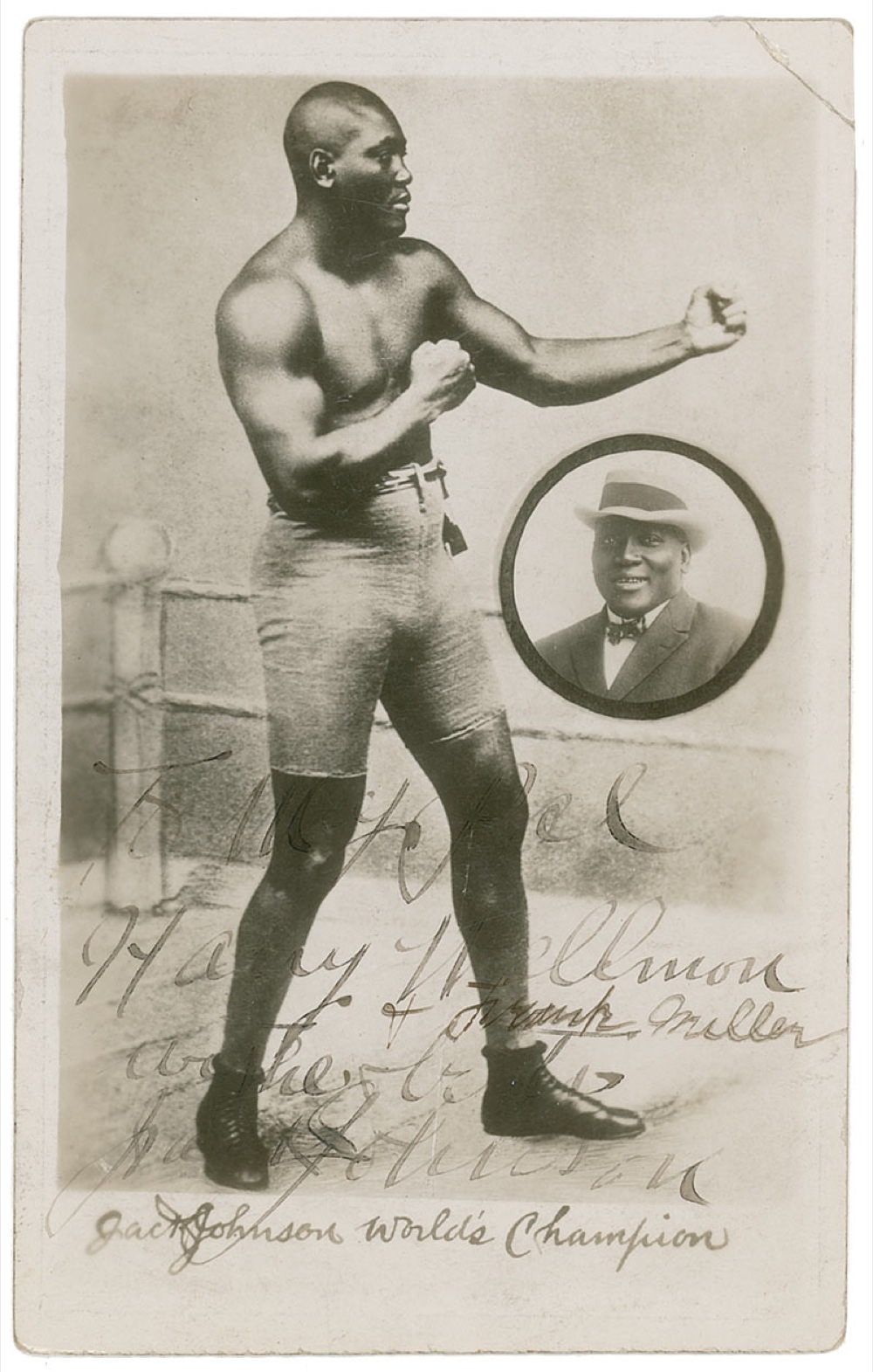 Vintage 3.5 x 5.5 postcard photo, signed and inscribed in fountain pen “To My Pal Harry Hellmon & Frank Miller, Wishes best, Jack Johnson.” In very good condition, with creased upper right corner (reinforced with archival tape on reverse), scattered surface wear, and silvering to the darker areas. Pre-certified Steve Grad/PSA/DNA and RRAuction COA.