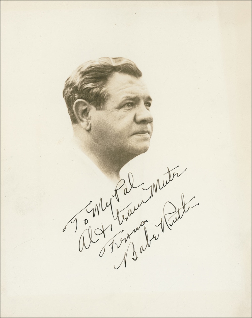 Vintage matte-finish 8 x 10 stoic bust photo, signed and inscribed in fountain pen “To My Pal Al & Team Mate From Babe Ruth.” In fine condition, with a hint of mild toning to edges. Ruth enjoyed adding ‘Pal’ to many of his autographs, but only three Yankees named Al held the honor: pitchers Al Shealy and Al Mamaux and catcher Al DeVormer, all of whom played with Ruth in the 1920s. Accompanied by a full letter of authenticity from PSA/DNA. RRAuction COA.