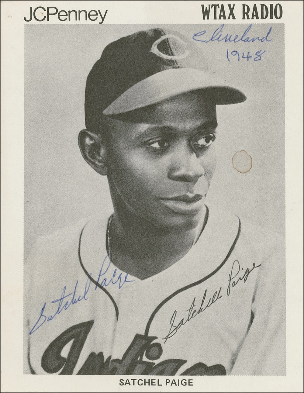 Color 4.25 x 5.5 paperstock promotional appearance from JCPenney and WTAX Radio, signed in blue ballpoint, “Satchel Paige, Cleveland 1948.” In fine condition, with light staining and a small moisture stain to the right of his face. Pre-certified Steve Grad/PSA/DNA and RRAuction COA.