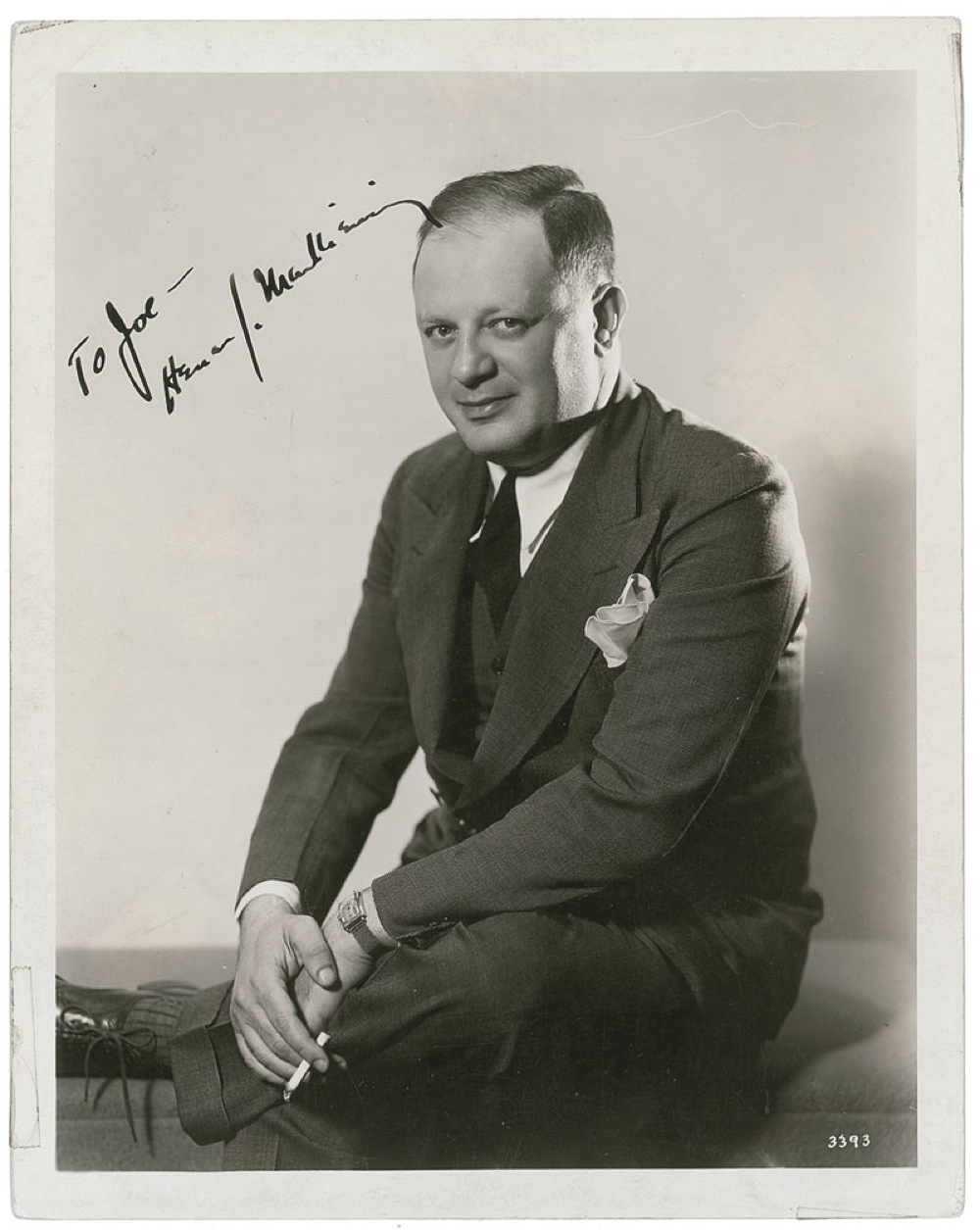 Screenwriter (1897-1953), who, with Orson Welles, wrote the screenplay for Citizen Kane. Vintage pearl-finish 8 x 10 publicity photo, signed and inscribed in fountain pen “To Joe—Herman Mankiewicz.” In fine condition, with some light spotting and toning from Culver Pictures stamps and labels on reverse, as well as the original promotional caption, and some scattered light creases and surface marks. Pre-certified PSA/DNA and RRAuction COA.