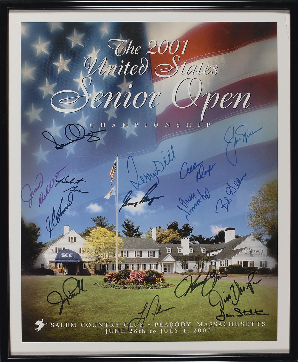 Color 17.5 x 22 poster for the 2001 United States Senior Open, signed in blue and black felt tip by 15 participants, including: Dana Quigley, Jack Nicklaus, Jim Colbert, Hubert Green, Terry Dill, Allen Doyle, J. C. Snead, Gary Player, Bruce Summerhayes, Bob Guilder, Larry Nelson, Jim Thorpe, and Dave Stockton. Framed to an overall size of 18.75 x 23. In fine condition. Consignor notes signatures were acquired by Quigley who had the poster signed and donated it to a charity auction. Pre-certified Steve Grad/PSA/DNA and RRAuction COA.