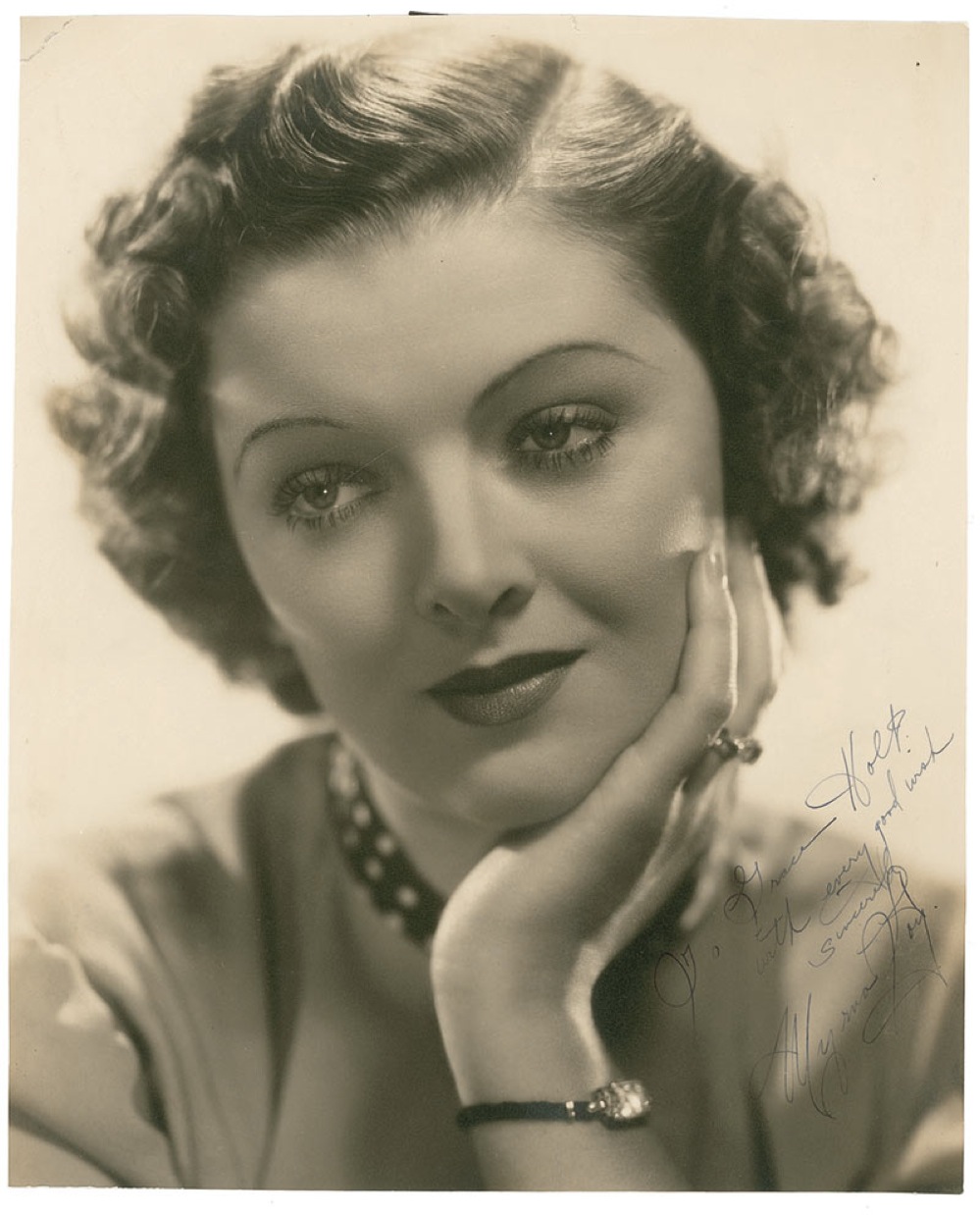 Vintage matte-finish 10.25 x 12.5 photo, signed and inscribed in fountain pen “To Grace Holt, with every good wish, sincerely, Myrna Loy.” In very good condition, with lightly trimmed edges, a few corner creases, a bit of light silvering, and a noticeable central vertical crease. The signature remains crisp and unaffected by any of the flaws. Pre-certified PSA/DNA and RRAuction COA.