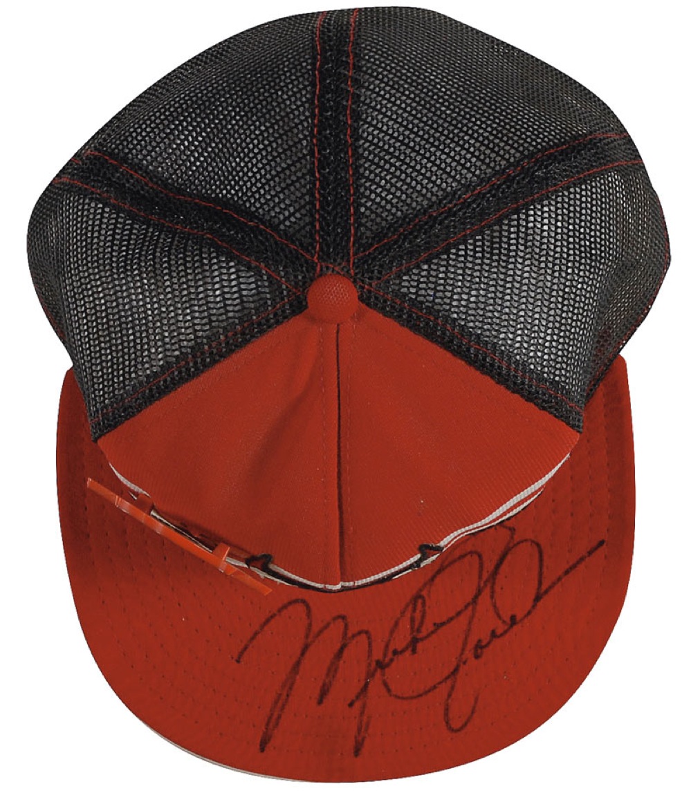 Official AJD Chicago Bulls baseball cap signed in black felt tip on the brim. An Air Jordan pin has been affixed to the front of the cap as well. In fine condition. Consignor notes signature was acquired at a public signing at the Chicago Arena in 1985. Pre-certified Steve Grad/PSA/DNA and RRAuction COA.