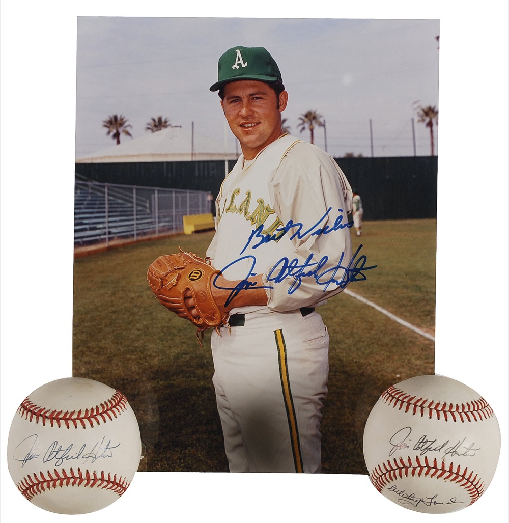 Three items: two official Rawlings American League baseballs, each signed on the sweet spot in ballpoint by Hunter, with one ball also signed on a side panel by Whitey Ford; and a color glossy 8 x 10 photo of Hunter as a member of the A’s, signed in blue felt tip. Scattered toning to balls, otherwise fine condition. RRAuction COA.