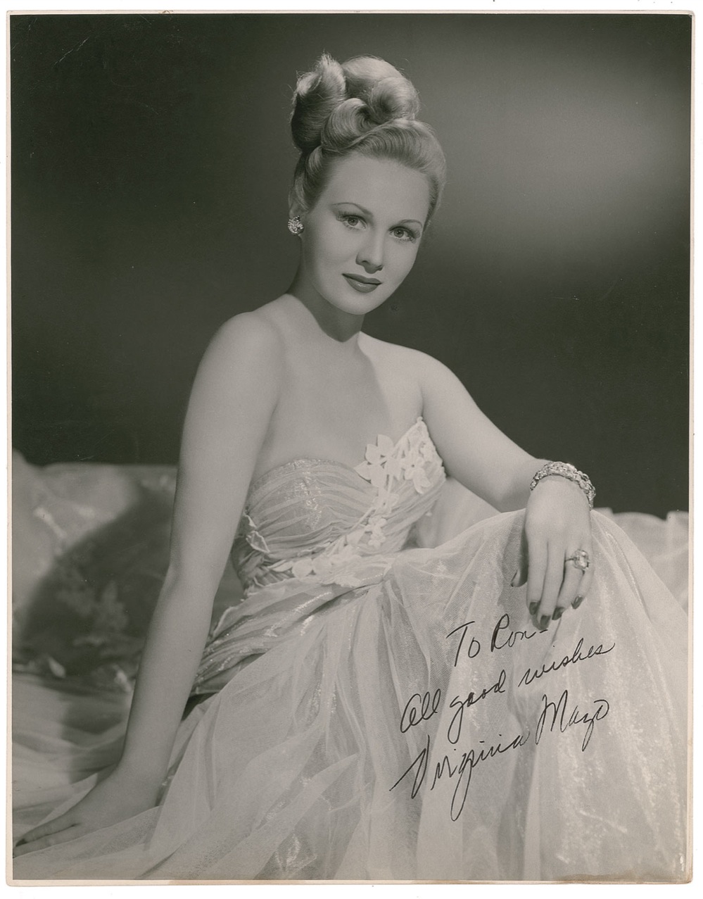 Vintage matte-finish 10.75 x 13.5 photo, signed and inscribed in fountain pen “To Ron, All good wishes, Virginia Mayo.” A crease to top left corner, a few scattered light surface marks, and some light staining along bottom edge, otherwise fine condition. Pre-certified PSA/DNA and RRAuction COA.
