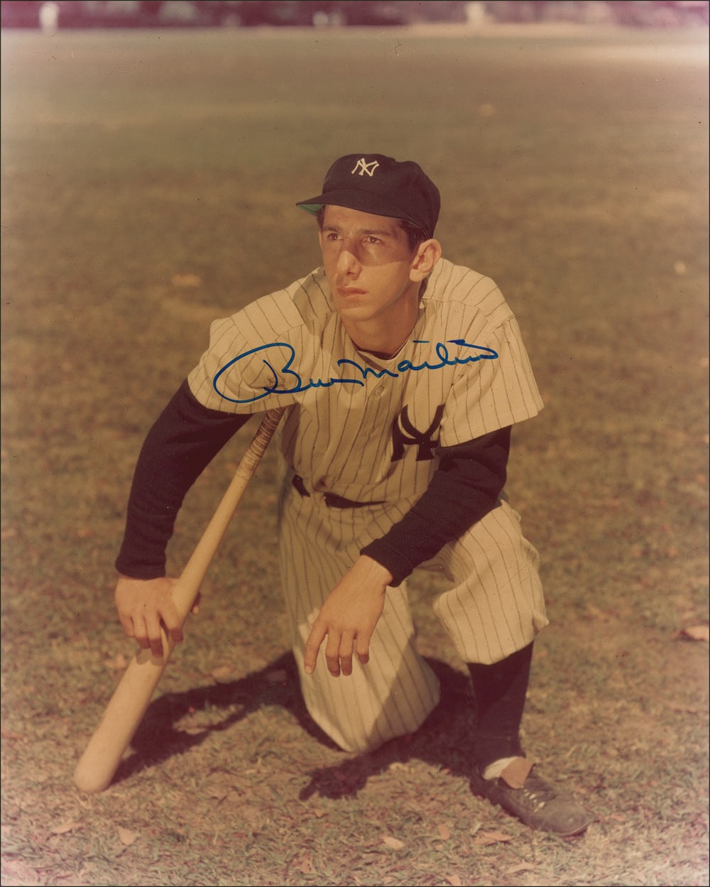 Color glossy 8 x 10 photo of a young Martin posing in his Yankee pinstripes, signed in blue felt tip. A few creases to left side, otherwise fine condition. Pre-certified Steve Grad/PSA/DNA and RRAuction COA.