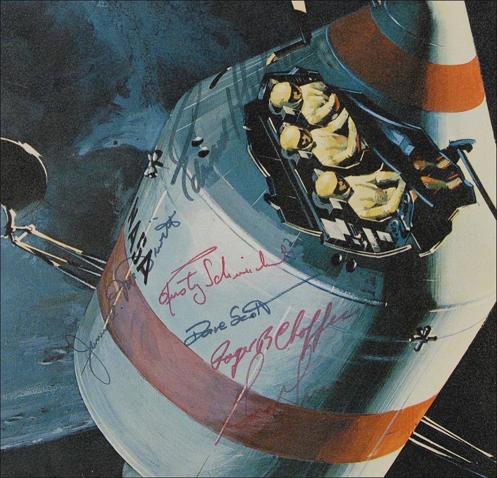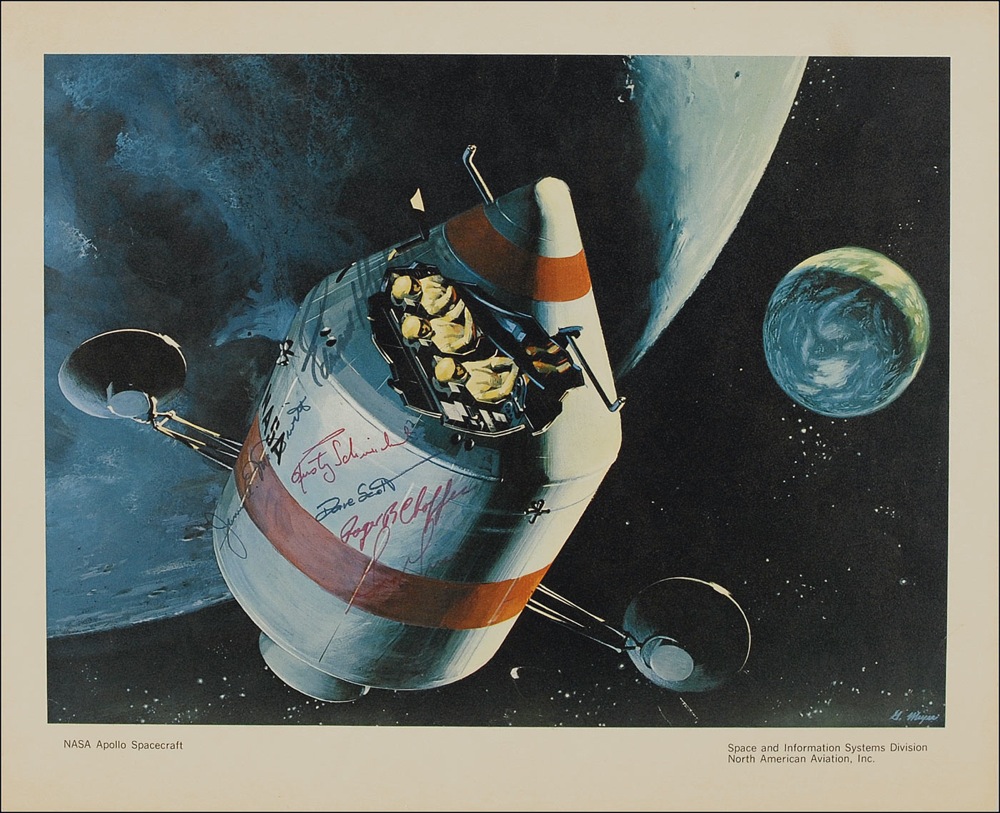 Color 15 x 12.5 print entitled NASA Apollo Spacecraft, by the Space and Information Systems Division of North American Aviation, Inc., depicting an artist’s rendition of an Apollo capsule and service module orbiting the moon, with the three astronauts seated inside, signed in black and red felt tip by Apollo 1’s primary and back-up crew: Gus Grissom, Edward H. White II, Roger B. Chaffee, James McDivitt, Rusty Schweickart, and Dave Scott. Moderate to heavy contrast to portions of White and Grissom’s signatures, and a few mild corner creases, otherwise fine condition. Ironically, it was North American Aviation which built the Apollo Command Module, whose original suggestions in designing the capsule included that the hatch open outward and an oxygen/nitrogen mix used in the cabin, both of which were overruled by NASA. Both of these changes by NASA would be contributing factors to Grissom, White, and Chaffee perishing in the Apollo 1 fire. Pre-certified Scott Cornish and RRAuction COA.