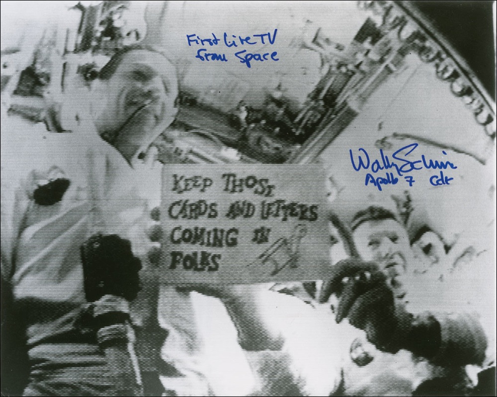 Glossy 10 x 8 NASA photo of Wally Schirra and Donn Eisele during the first television broadcast from space, with Schirra holding cue card reading “Keep those cards and letters coming in folks,” and signed in blue felt tip, “First live TV from space, Wally Schirra, Apollo 7 cdr.” In very fine condition. Pre-certified Scott Cornish and RRAuction COA.