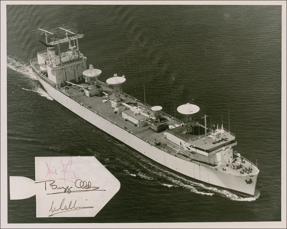 Glossy 10 x 8 photo of the USNS Redstone, signed in black ink in a white silhouette of the Apollo 11 capsule integral to the image at lower left, “Neil Armstrong,” “Buzz Aldrin,” and “M. Collins.” Accompanied by a notarized letter of provenance from the original owner, who explains that he was a contract employee on the Redstone from 1967 to 1969, and that he specially prepared the photo and obtained the signatures through NASA. A few dings, surface marks, and light creases (one just touching top of Armstrong’s “A”), and slight fading to Armstrong’s signature (which remains clear and well contrasted against the white background; tops of initials against darker background), otherwise fine condition. The Redstone was one of the seagoing tracking ships used on all the Apollo missions. A rare and unique example for the Apollo completist! Pre-certified Scott Cornish and RRAuction COA.