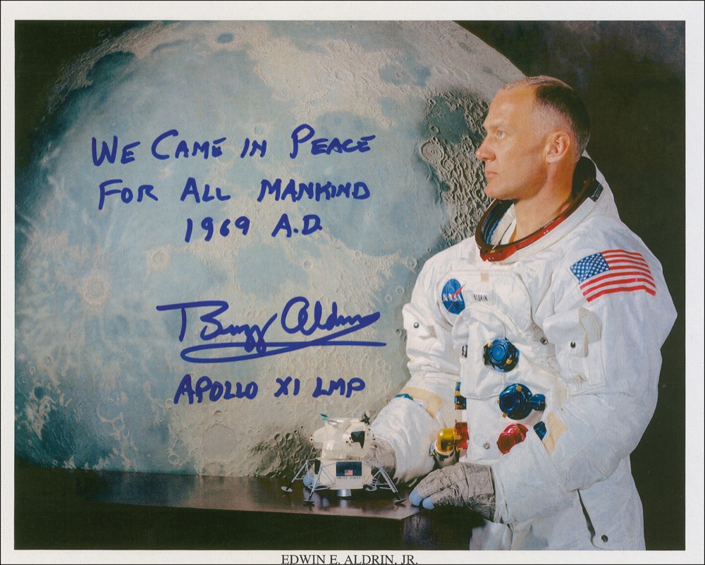 Outstanding color 10 x 8 NASA photo of Aldrin, clad in his white space suit, in profile with a lunar lander model, signed in blue felt tip, “We came in peace for all mankind, 1969 A.D., Buzz Aldrin, Apollo XI LMP.” In very fine condition.