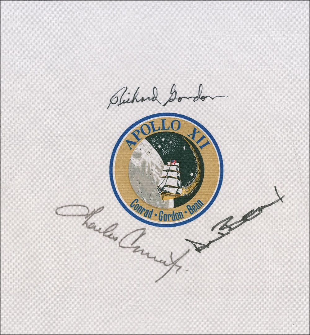 An 8.5 x 9 swatch of Beta cloth with a printed Apollo 12 mission emblem in the center, signed in black felt tip by crew members Charles Conrad, Alan Bean, and Richard Gordon. In fine condition, with a couple thin lines near edges from previous tape. Very nice for display. Pre-certified Scott Cornish and RRAuction COA.