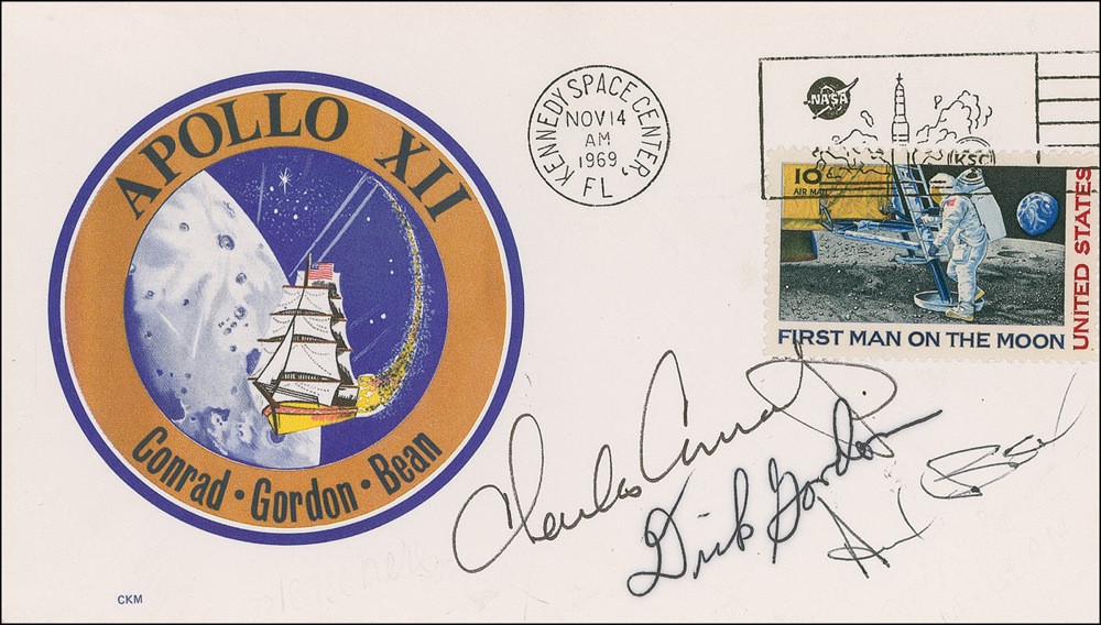 Apollo 12 launch date postal cover bearing a cachet of the Apollo 12 mission emblem, signed in black ink by Charles Conrad, Dick Gordon, and Alan Bean. In fine condition, with a bit of mild haloing around Gordon’s signature. Pre-certified Scott Cornish and RRAuction COA.