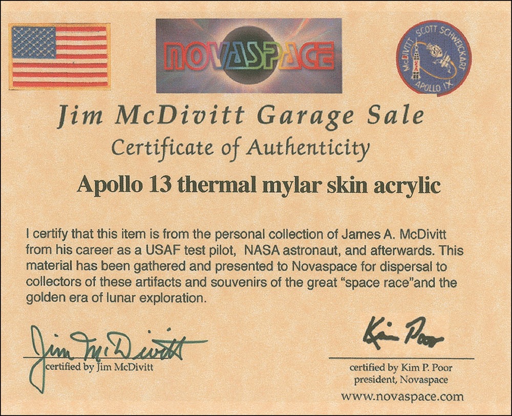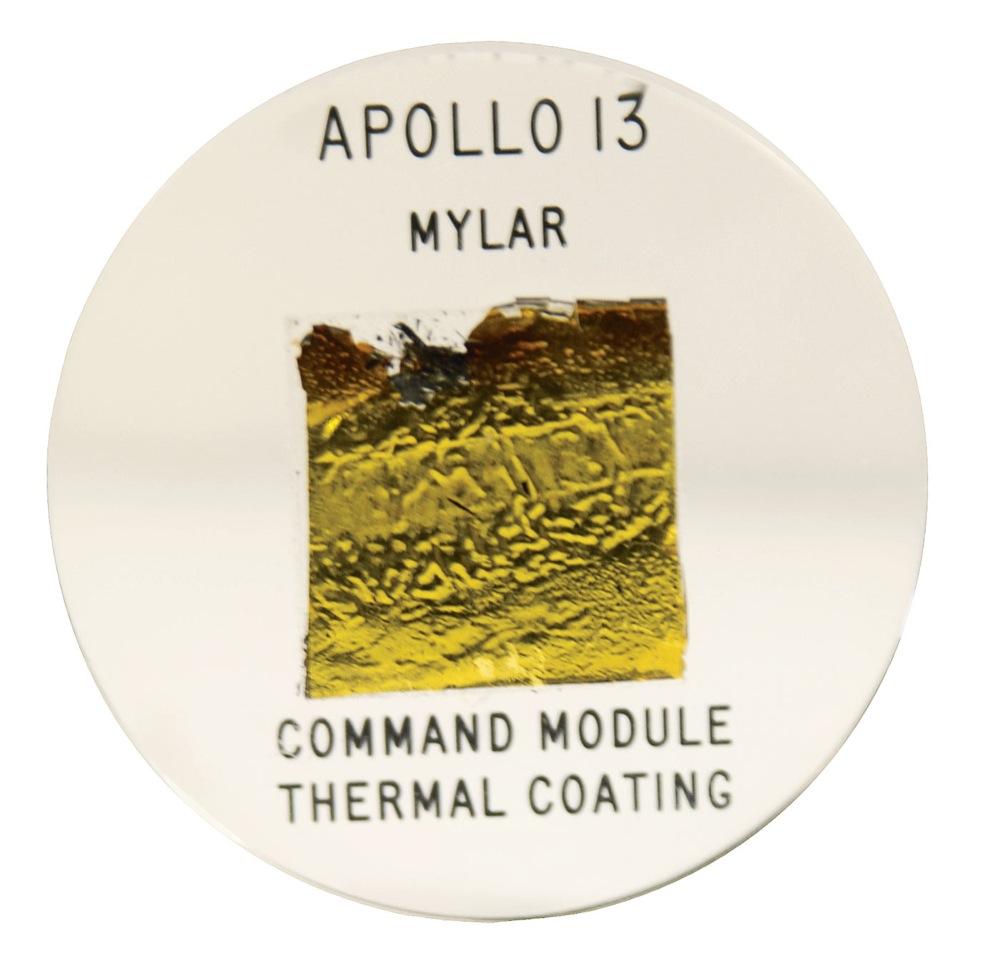 Mylar skin, approximately 1 x 1, taken from the Apollo 13 Command Module after its miraculous safe return to Earth in 1970. Wonderfully displayed within a 2.25”-diameter x 1”-tall clear plastic disk imprinted, “Apollo 13 Mylar Command Module Thermal Coating.” Accompanied by a certificate of authenticity from Novaspace. RRAuction COA.