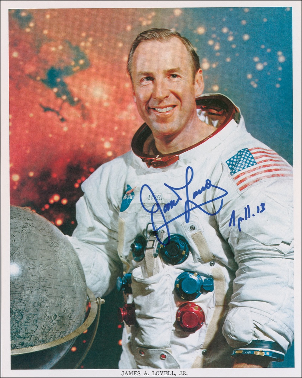 Color 8 x 10 NASA photo of Lovell posing in his space suit against a celestial background, signed in blue felt tip, “James Lovell, Apollo 13.” In very fine condition. Accompanied by a certificate of authenticity from Novaspace stating the photo comes from Lovell’s own stock. Pre-certified Scott Cornish and RRAuction COA.