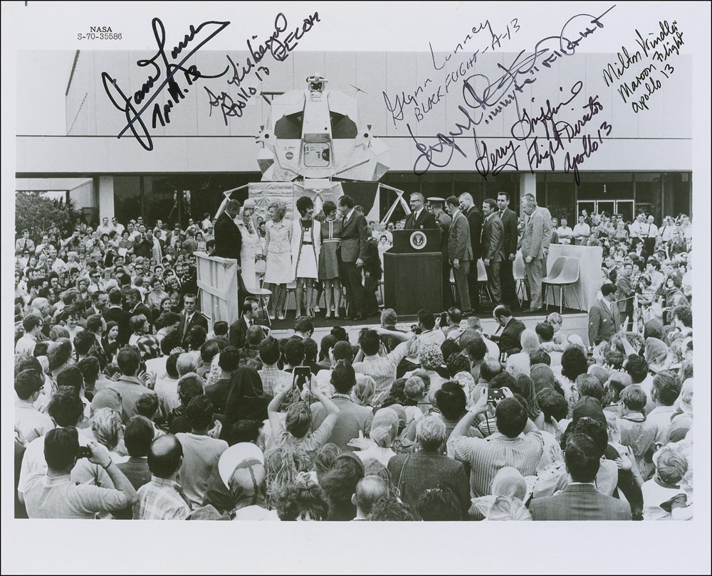 Glossy 10 x 8 NASA photo of an Apollo 13 post-flight presentation ceremony which included then president Richard Nixon, signed in black felt tip, “James Lovell, Apollo 13,” and also signed in black ink and felt tip by five others involved in the mission: Gene Kranz, Sy Liebergot, Gerry Griffin, Glynn Lunney and Milton Windler. In fine condition, with a few scattered dings and creases, and a small tear to top edge. Pre-certified Scott Cornish and RRAuction COA.