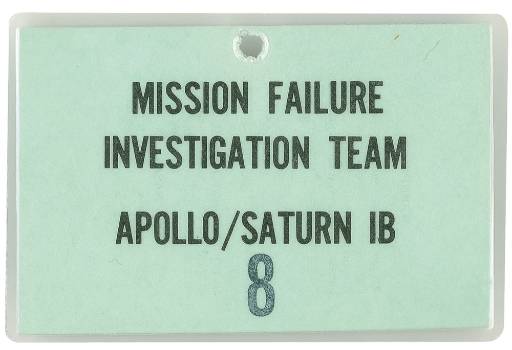 Rare Apollo 1 investigation badge #8, measuring 3.5 x 2.25. These badges were issued to and worn by personnel involved in the investigation of the Apollo 1 fire. Badge reads, “Mission Failure Investigation Team, Apollo/Saturn 1B.” It appears that those numbered from 1 to 10 were a very pale green and were issued to NASA employees. Badge has been laminated and a punch hole to top center is present. Reverse bears a printed government warning regarding unlawful possession or counterfeiting. On January 27, 1967, astronauts Gus Grissom, Ed White, and Roger Chaffee were killed in a fire while testing their capsule. The mission failure investigation team was formed to determine the cause of the tragedy, and resulted in a 20-month postponement of the Apollo program as well as many design changes. RRAuction COA.
