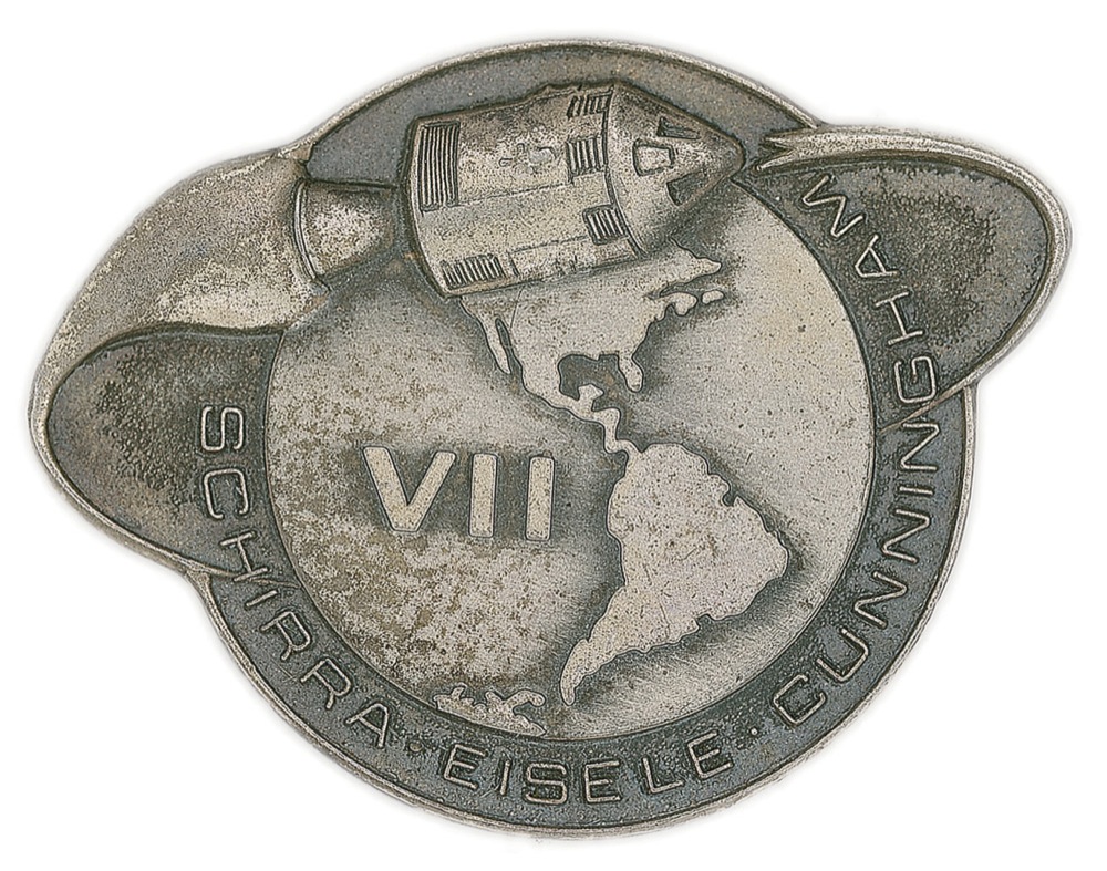Flight-flown Apollo 7 Robbins Medal, approximately 1.25 x 1, with a raised design on the face of the mission insignia—a capsule orbiting Earth, the mission number, and the last names of crew members Wally Schirra, Donn Eisele, and Walt Cunningham. The reverse of the sterling silver medal is engraved “Oct. 11, 1968” and numbered “71 of 255.” Normal condition. This was the very first Robbins Medal, designed for the Apollo 7 mission for Cunningham who wanted a special memento to take on the mission. The flown treasure proved so popular that every mission into space since has carried on the tradition. Made by the Robbins Company of Attleboro, Massachusetts, astronauts who are in line for a flight have the option of purchasing the medallions for themselves, family, and friends as personal souvenirs. The medals are made available only to the astronauts. At the conclusion of a flight, the tokens are sent back to Robbins, where they are engraved on the reverse, polished, numbered, and returned to the astronauts. The dyes are later destroyed. Remarkably scarce flight-flown mementos such as this rarely find their way to the marketplace. Accompanied by a certificate of authenticity from Joe Garino, Jr., former NASA physical conditioning supervisor. RRAuction COA.