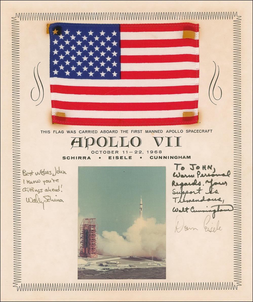 Flight-flown printed fabric American flag, 6 x 4, flown aboard Apollo 7, the first manned Apollo mission. Flag is affixed by its corners to a 10 x 12 certificate stating “This flag was carried aboard the first manned Apollo spacecraft Apollo VII.” Signed and inscribed in black felt, “Best Wishes John. I know you’re gittings [sic] ahead! Wally Schirra,” “To John, Warm personal regards. Your support is tremendous, Walt Cunningham,” and signed by Donn Eisele. Originally presented to John Holland, who was in charge of NASA’s photographic laboratories. In fine condition, with a faint block of toning over most of the certificate and small squares of toning to each corner of flag from adhesive on reverse. Pre-certified Scott Cornish and RRAuction COA.