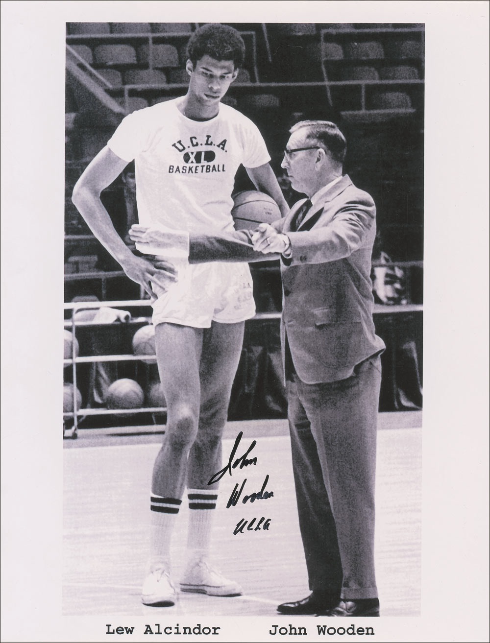 Glossy 11 x 14 photo of Wooden coaching Lew Alcindor, signed in black felt tip, “John Wooden UCLA.” In fine condition, with some light creases along top edge. Pre-certified Steve Grad/PSA/DNA and RRAuction COA.