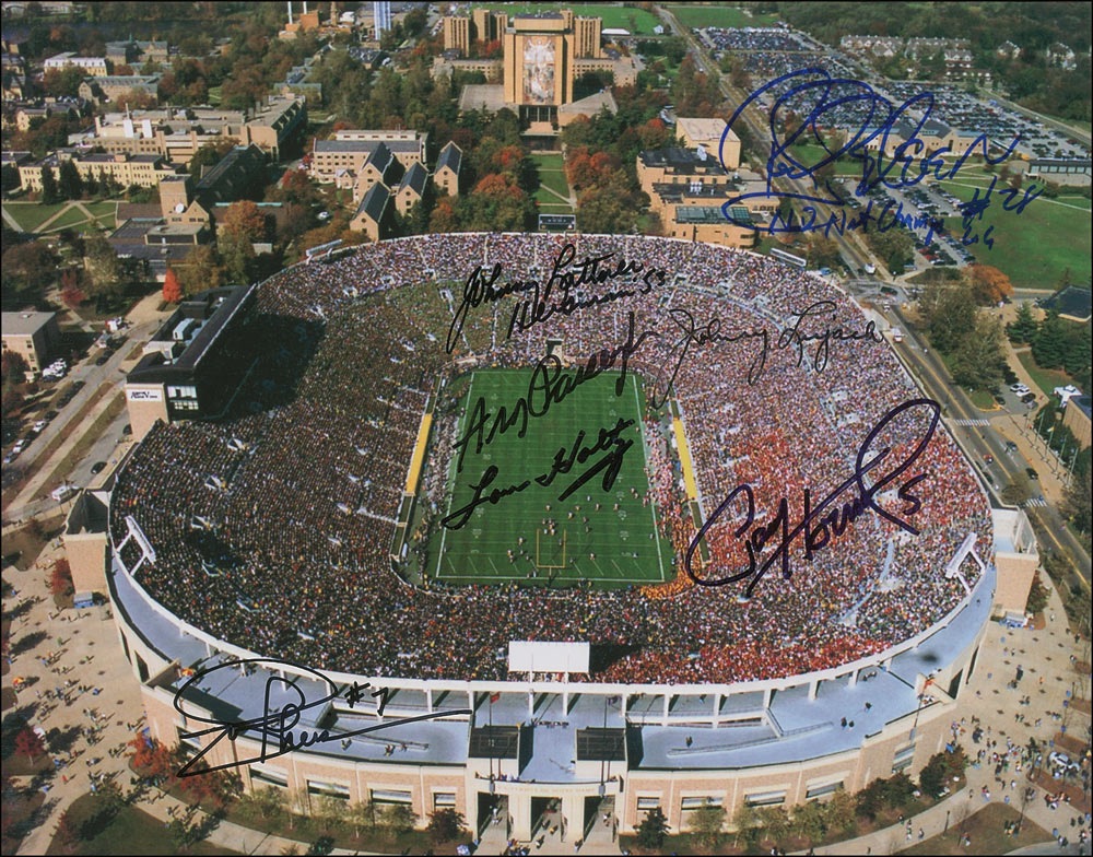 Color glossy 14 x 11 photo of a jam-packed Notre Dame Stadium, signed in blue and black felt tip by Ara Parseghian, Lou Holtz, Paul Hornung, Johnny Lujack, Johnny Lattner, Joe Theismann, and Rocky Bleier. In very fine condition. Pre-certified Steve Grad/PSA/DNA and RRAuction COA.