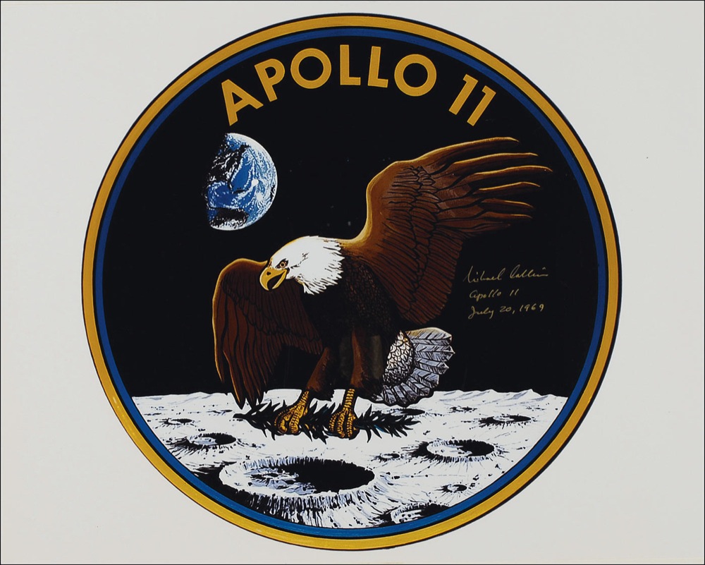 Impressive color satin-finish 16 x 20 photo of the Apollo 11 mission patch, signed in gold ink, “Michael Collins, Apollo 11, July 20, 1969.” In fine condition. Pre-certified Scott Cornish and RRAuction COA.