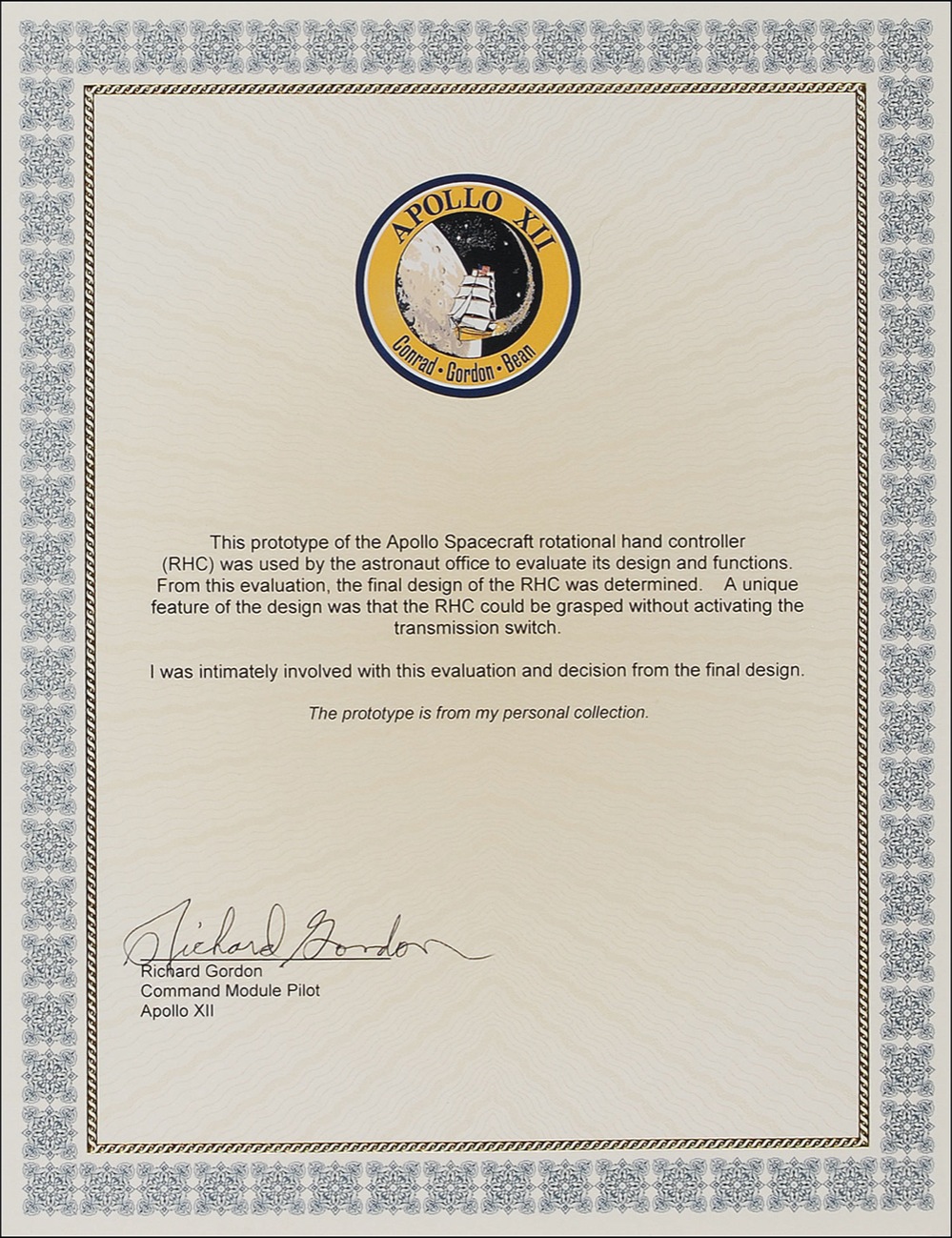 Prototype model of the controller that steered the Apollo spacecraft to the moon. Standing 6.5” tall, the rotational controller’s design was then evaluated by the astronaut office. Originating from the personal collection of astronaut Dick Gordon, and accompanied by a signed letter of authenticity from Gordon. That document reads in full: “This prototype of the Apollo Spacecraft rotational hand controller (RHC) was used by the astronaut office to evaluate its design and functions. From this evaluation, the final design of the RHC was determined. A unique feature of the design was that the RHC could be grasped without activating the transmission switch. I was intimately involved with this evaluation and decision from the final design. The prototype is from my personal collection.” RRAuction COA.