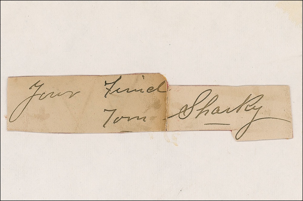 Heavyweight boxer (1873-1953) whose career spanned from 1893-1904, and who lost a 25-round fight to James Jeffries in 1899. Jeffries always claimed that Sharkey gave him his hardest fights stating that Sharkey was the roughest, toughest and bravest man he ever fought. Vintage ink signature, “Your friend, Tom Sharkey,” on an off-white irregularly clipped slip affixed to an identically sized clipped piece of cardstock, and in turn affixed to a 4.5 x 3.25 card. In very good condition, with repaired complete separation between first and last name of signature, and scattered toning and soiling. Pre-certified Steve Grad/PSA/DNA and RRAuction COA.