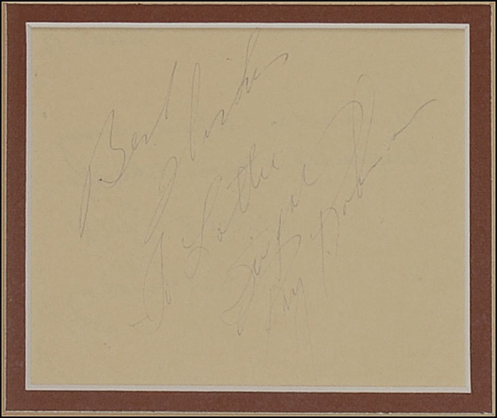 Fountain pen signature and inscription, “Best Wishes to Lottie. Sugar Ray Robinson,” on a light tan 4.25 x 3.5 album page. Double-matted with a glossy photo of the champ in a boxing pose and framed to an overall size of 14 x 20.75. In fine condition, with signature somewhat light and show-through from writing on the reverse. Pre-certified Steve Grad/PSA/DNA and RRAuction COA.