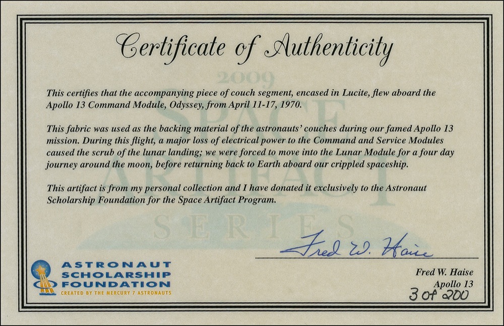 Limited edition fabric swatch, #3/200, approximately 1 x 1.5, of backing material of the astronaut’s couch aboard the Apollo 13 command module ‘Odyssey,’ from the personal collection of Fred Haise. Swatch is encased in a curved Lucite cylinder measuring 4 x 2.25. Bottom of the encased Apollo 13 color seal bears printed information regarding the swatch, and bears a printed signature of Haise. Accompanied by a certificate of authenticity signed by Haise, indicating “This artifact is from my personal collection and I have donated it exclusively to the Astronaut Scholarship Foundation for the Space Artifact Program.” RRAuction COA.