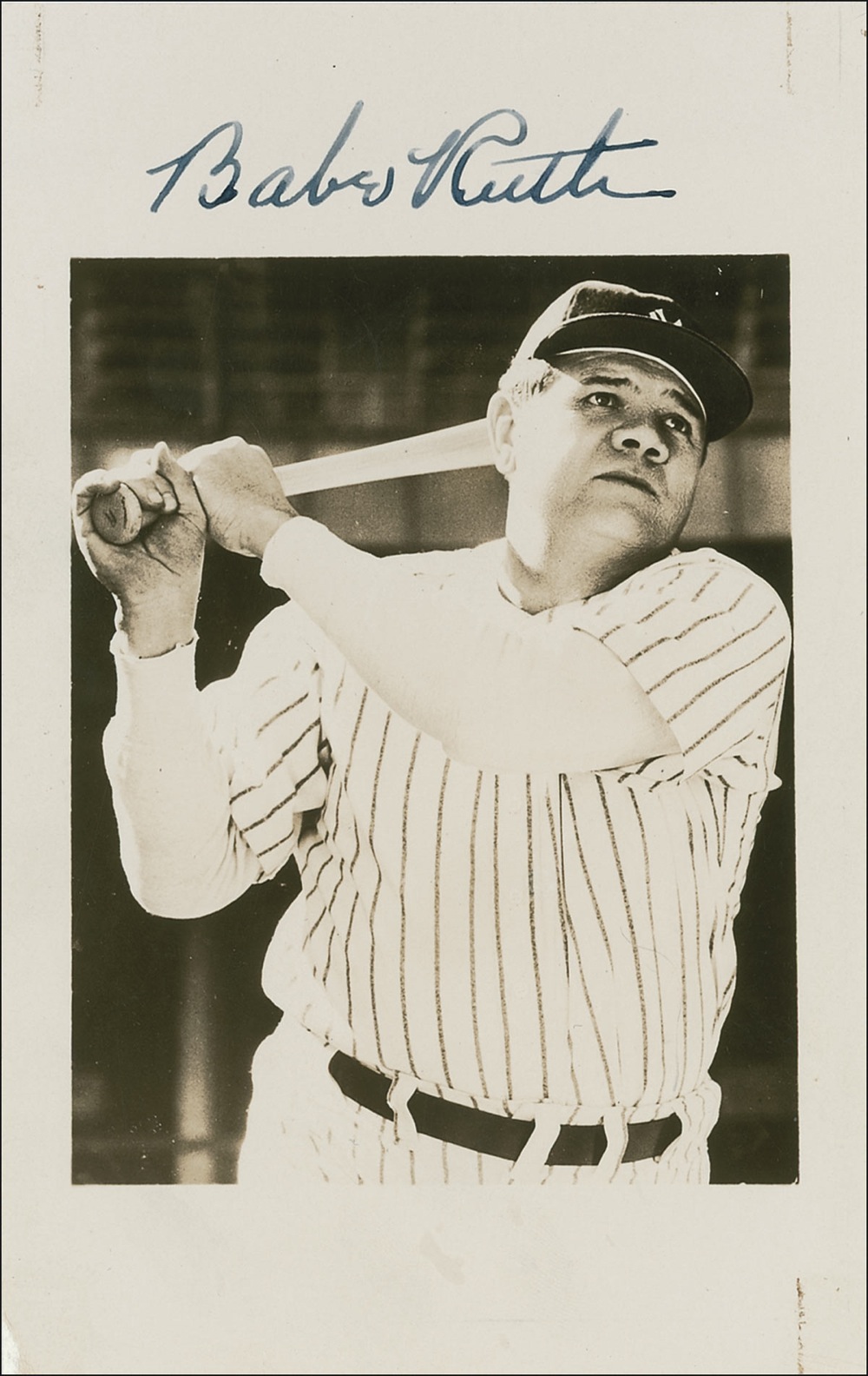 Iconic vintage pearl-finish 3.5 x 5.5 signed photograph of Ruth in his Yankee pinstripes, swinging for the fences, beautifully signed in fountain pen at the top border. A few small creases (one of which touches Ruth’s hand), small scratches far removed at the edges, and a bit of silvering to some of the darker areas, otherwise fine condition. A bold signature and photo of Ruth doing what he did best. Pre-certified Steve Grad/PSA/DNA and RRAuction COA.