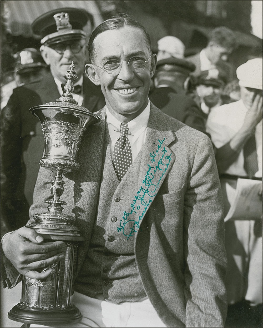 Professional golfer (1893–1967) who at the 1913 US Open at the Country Club changed the perceptions of an entire sport with a stunning triumph. He was inducted into the World Golf Hall of Fame in 1974. Vintage matte-finish 7.5 x 9.5 photo, signed and inscribed in green ink 'With every good wish to Jim Wiggins. Francis Ouimet.' Stamped on the reverse with a Wide World Photos credit. In fine condition, with scattered creases and a circular impression at the bottom of the photo. Pre-certified Steve Grad/PSA/DNA and RRAuction COA.