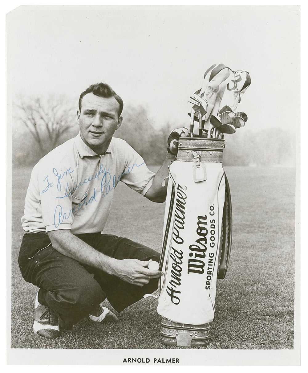 Golfer generally regarded as one of the greatest players in the history of men's professional golf. Vintage glossy 7.5 x 9.25 photo of Palmer with a specially designed Wilson golf bag, signed and inscribed in blue ballpoint 'To Jim, Sincerely, Arnold Palmer.' Creasing mainly confined to the top of the photo and a missing upper left corner, otherwise fine condition. One of the youngest signed Palmer photos we have seen with a vintage signature! Pre-certified Steve Grad/PSA/DNA and RRAuction COA.