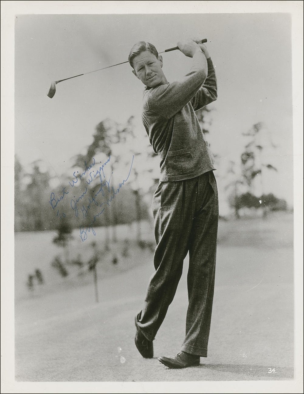 PGA golfer (1912–2006) mostly remembered today for having won 11 consecutive tournaments and 18 total tournaments in 1945. He was elected to the World Golf Hall of Fame in 1974. Vintage glossy 8 x 10.25 photo of Nelson swinging a wood, signed and inscribed in fountain pen 'Best Wishes To Jim Wiggins. Golfingly, Byron Nelson.' In very good condition, with heavy horizontal crease through the middle of the image touching part of the sentiment, and other scattered creases. Pre-certified Steve Grad/PSA/DNA and RRAuction COA.