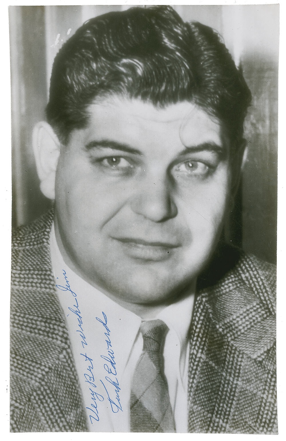 Football Hall of Famer (1907–1973). Vintage glossy 4.25 x 7 photo of Edwards in a suit and tie, later signed and inscribed diagonally in blue ballpoint across his shirt collar, "Very Best Wishes, Jim. Turk Edwards." Date-stamped on the reverse "JAN 24 1946" with a faint Associated Press credit stamping. Silvering to some of the darker portions, scattered light creasing, and trimmed edges, otherwise fine condition. Pre-certified Steve Grad/PSA/DNA and RRAuction COA.