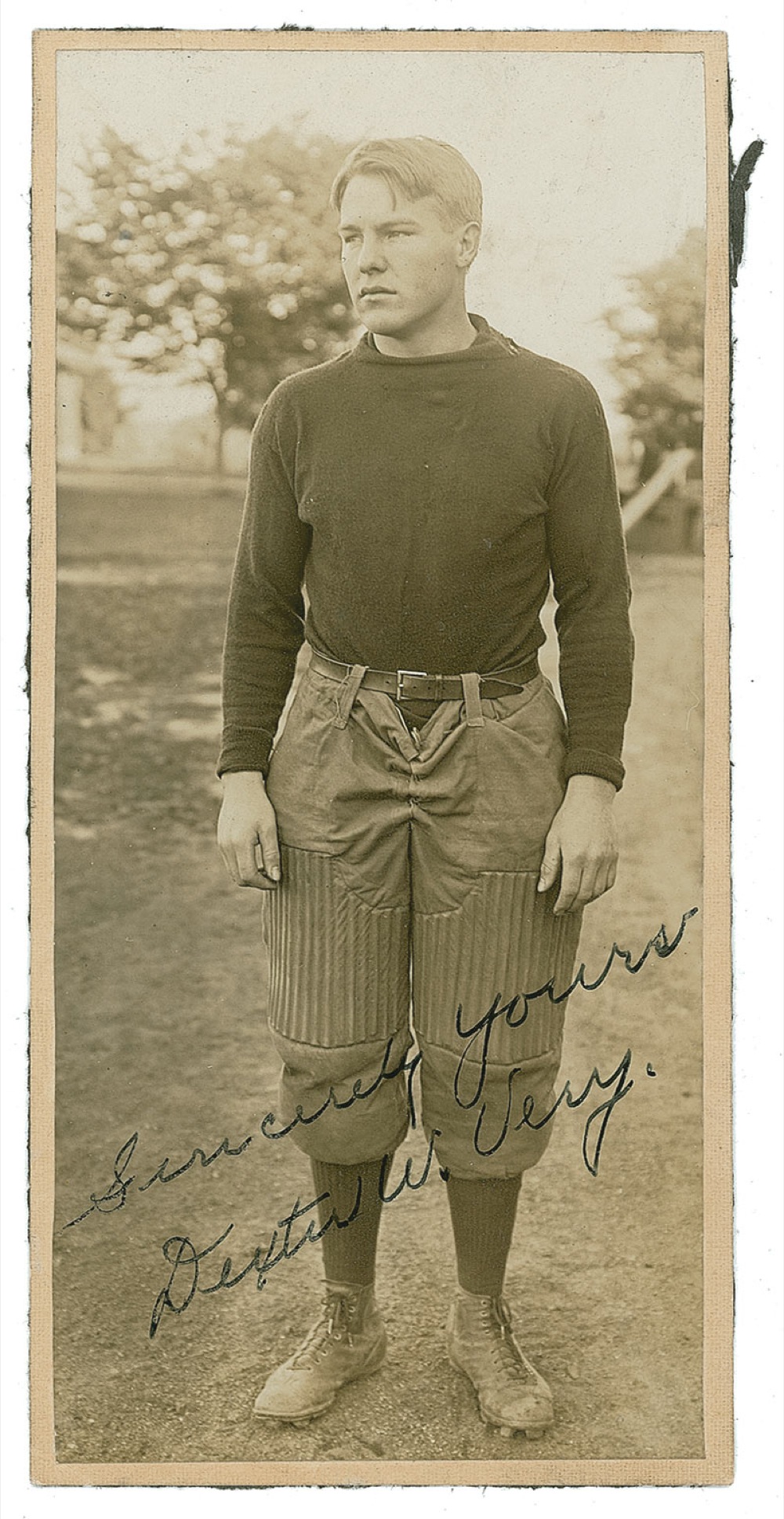 College Football Hall of Famer (1889-1980) considered one of the greatest players in the early days of Penn State University. Vintage 2.5 x 5.5 lightweight photo of Very in his uniform, signed in fountain pen, "Sincerely yours, Dexter W. Very." Photo is affixed to a slightly larger card. In fine condition. RRAuction COA.