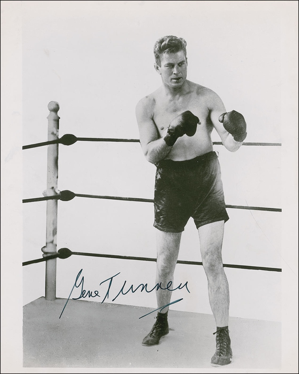 Heavyweight boxing champion and Hall of Famer (1897–1978) from 1926 to 1928 who defeated Jack Dempsey in 1926 and 1927 and retired after winning against Tom Heeney in 1928. Glossy 8 x 10 full-length photo of Tunney in his prime, signed in black felt tip. In fine condition, with a few scattered light surface marks. Pre-certified Steve Grad/PSA/DNA and RRAuction COA.