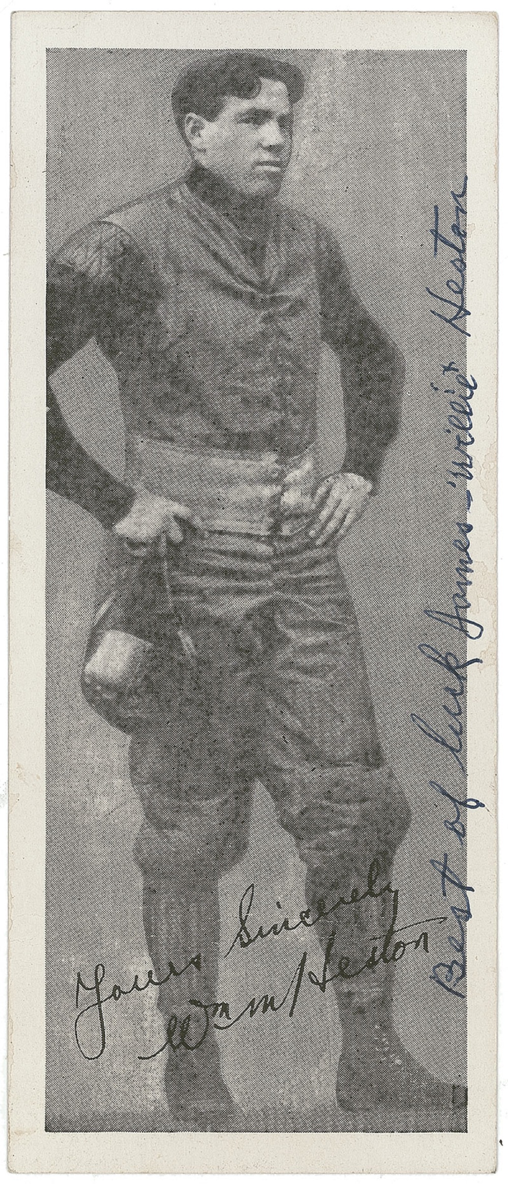 College Football Hall of Famer (1878-1963). Cardstock 2.5 x 6 photo of a print of Heston in his uniform, signed and inscribed vertically in blue ink "Best of luck James - 'Willie' Heston." In fine condition, with a few light horizontal creases to lower portion of image. RRAuction COA.