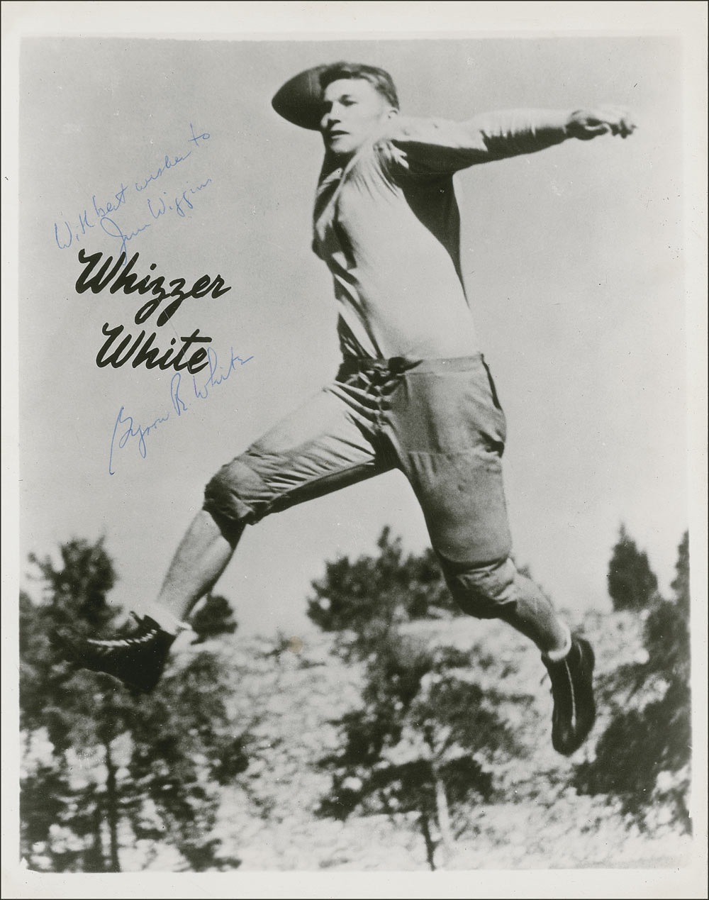 Football star at Colorado who went on to serve as an Associate Justice of the Supreme Court from 1962-1993. Vintage glossy 8 x 10 photo of White leaping into the air preparing to pass the ball, signed and inscribed later in blue ballpoint "With best wishes to Jim Wiggins, Byron R. White." Two horizontal creases, and some scattered light creases to edges and corners, otherwise fine condition. Pre-certified Steve Grad/PSA/DNA and RRAuction COA.