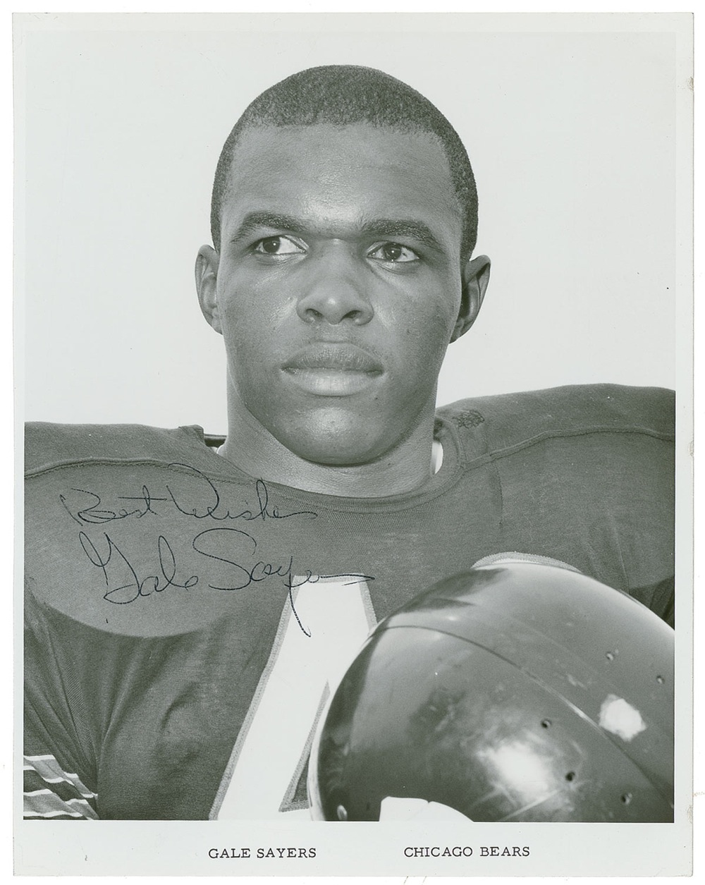 Pro Football Hall of Famer known as ‘The Kansas Comet.’ Vintage glossy 8 x 10 photo of a young and determined-looking Sayers in his Chicago Bears uniform, signed in black ballpoint. In fine condition, with a few scattered light surface impressions, light binder dings to right edge, and a bit of light horizontal edge curling. Pre-certified Steve Grad/PSA/DNA and RRAuction COA.