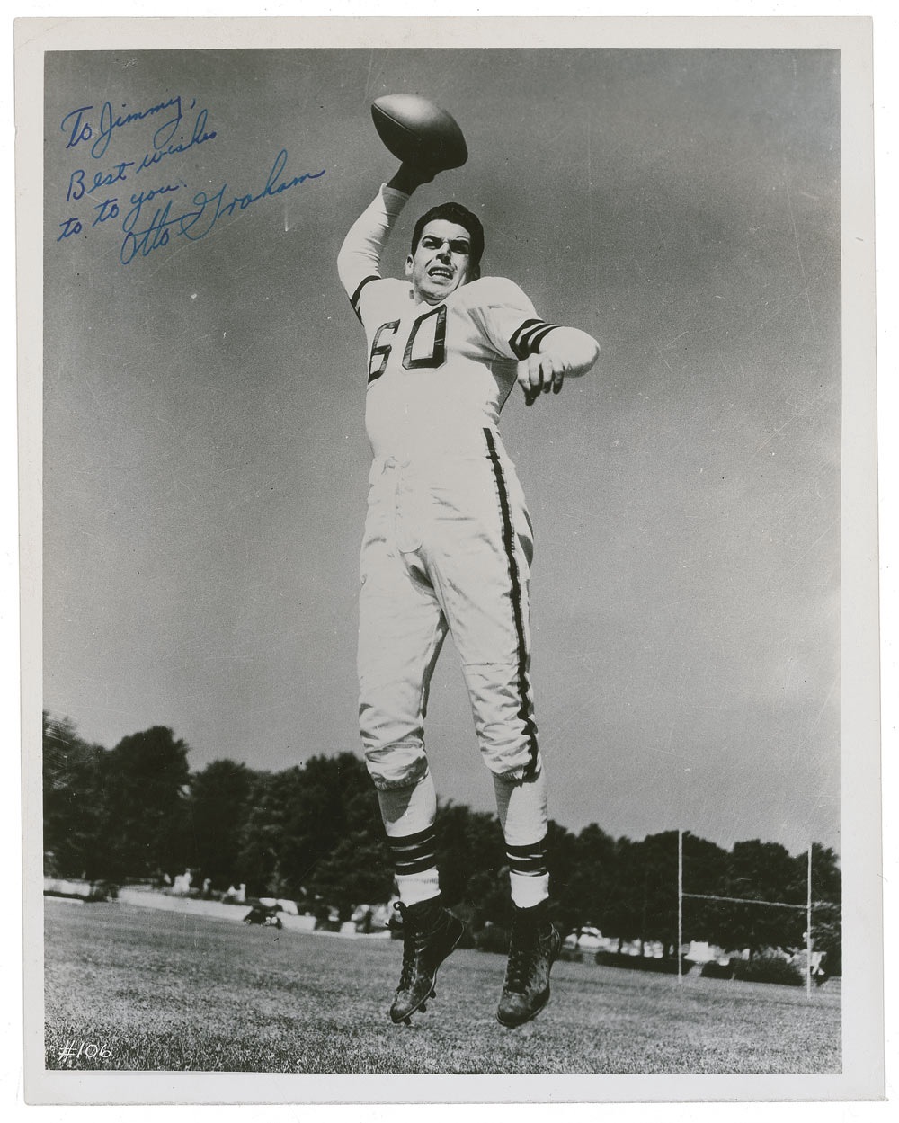 Football Hall of Famer (1921-2003). Intense vintage glossy 8 x 10 photo of Graham leaping into the air in his Cleveland Browns uniform, signed and inscribed in fountain pen "To Jimmy, Best wishes to to [sic] you. Otto Graham." Scattered creasing including some touching his face and impressions from a handwritten notation on the reverse, otherwise fine condition. Pre-certified Steve Grad/PSA/DNA and RRAuction COA.