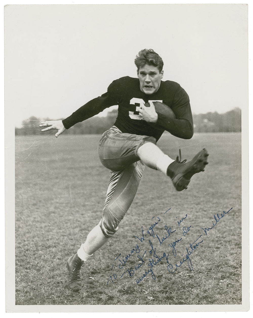 College Football Hall of Famer (1922-2002), who later, as an attorney, was critical in helping to organize the National Football League Players Association. Vintage glossy 8 x 10 photo of Miller high-stepping with the ball, signed and inscribed in fountain pen "To Jimmy Wiggins - Best of luck in everything you do. Creighton Miller." In very good condition, with scattered creases and surface marks, and other light surface marks inherent to the original negative. Pre-certified Steve Grad/PSA/DNA and RRAuction COA.