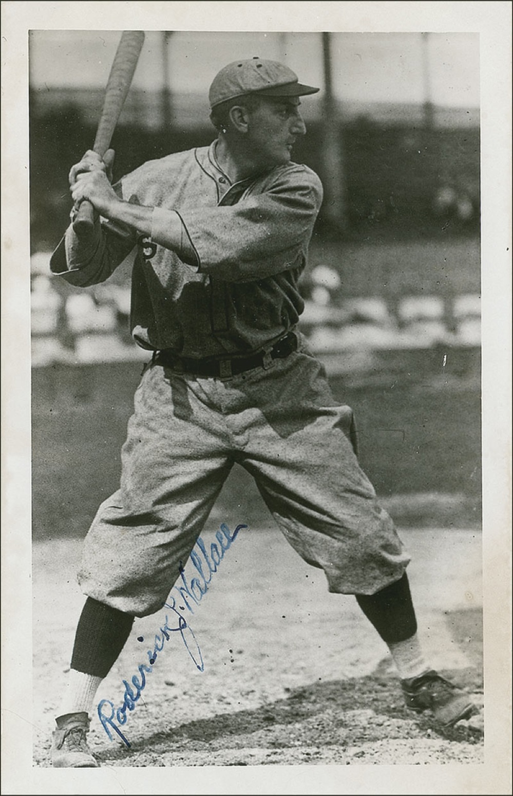 Baseball Hall of Famer (1873-1960). Vintage matte-finish 3.5 x 5.5 postcard photo of Wallace in a batting stance for the St. Louis Browns, signed in fountain pen 'Roderick J. Wallace.' A George Brace photography stamping appears on the reverse. In fine condition, with a crease to the lower left corner and a few surface marks. Wallace played for 24 seasons, and still holds the record for the longest career by a player who never played in a World Series. Pre-certified Steve Grad/PSA/DNA and RRAuction COA.