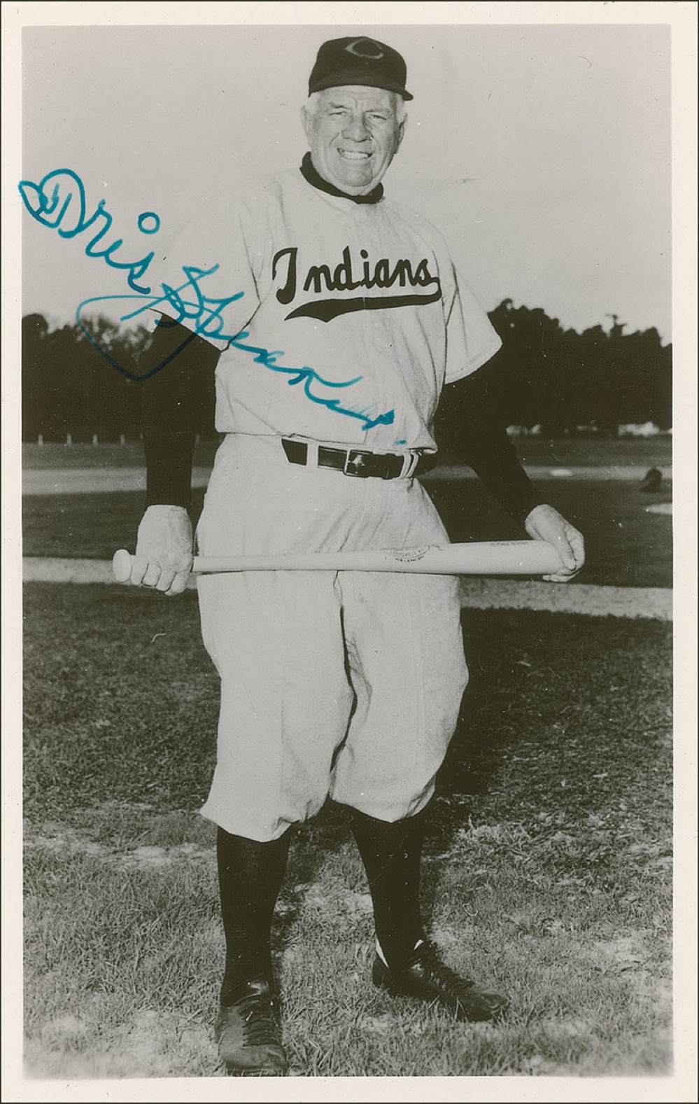 Seventh player elected to the Baseball Hall of Fame (1888–1958) and the greatest center fielder of his day. Vintage glossy 3.5 x 5.5 postcard photo of Speaker in his later years in a Cleveland Indians uniform, signed in fountain pen. In fine condition, with a brush to the end of his name. Pre-certified Steve Grad/PSA/DNA and RRAuction COA.